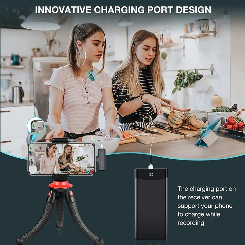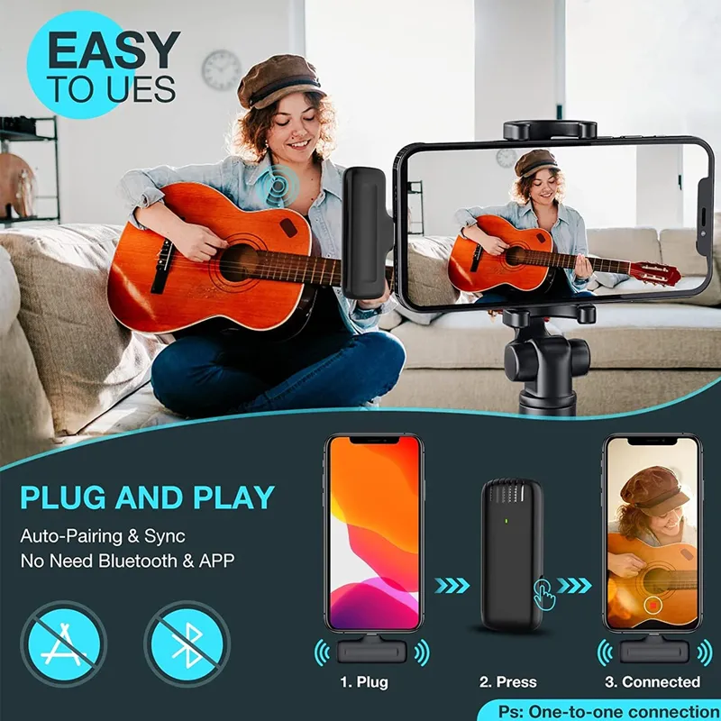 ??2 Transmitters & 1 Receiver Wireless Microphone?- This dual wireless lav mics system includes 2 transmitters and 1 receiver, not only can use a single microphone to record, but also allowing two sound sources simultaneously recording during the live stream. It is very easy to use, just clip the wireless microphones to your collar and plug the receiver into your Lightening port devices, they will automatically connect quickly. Don't need APP or Bluetooth, just plug and play directly.